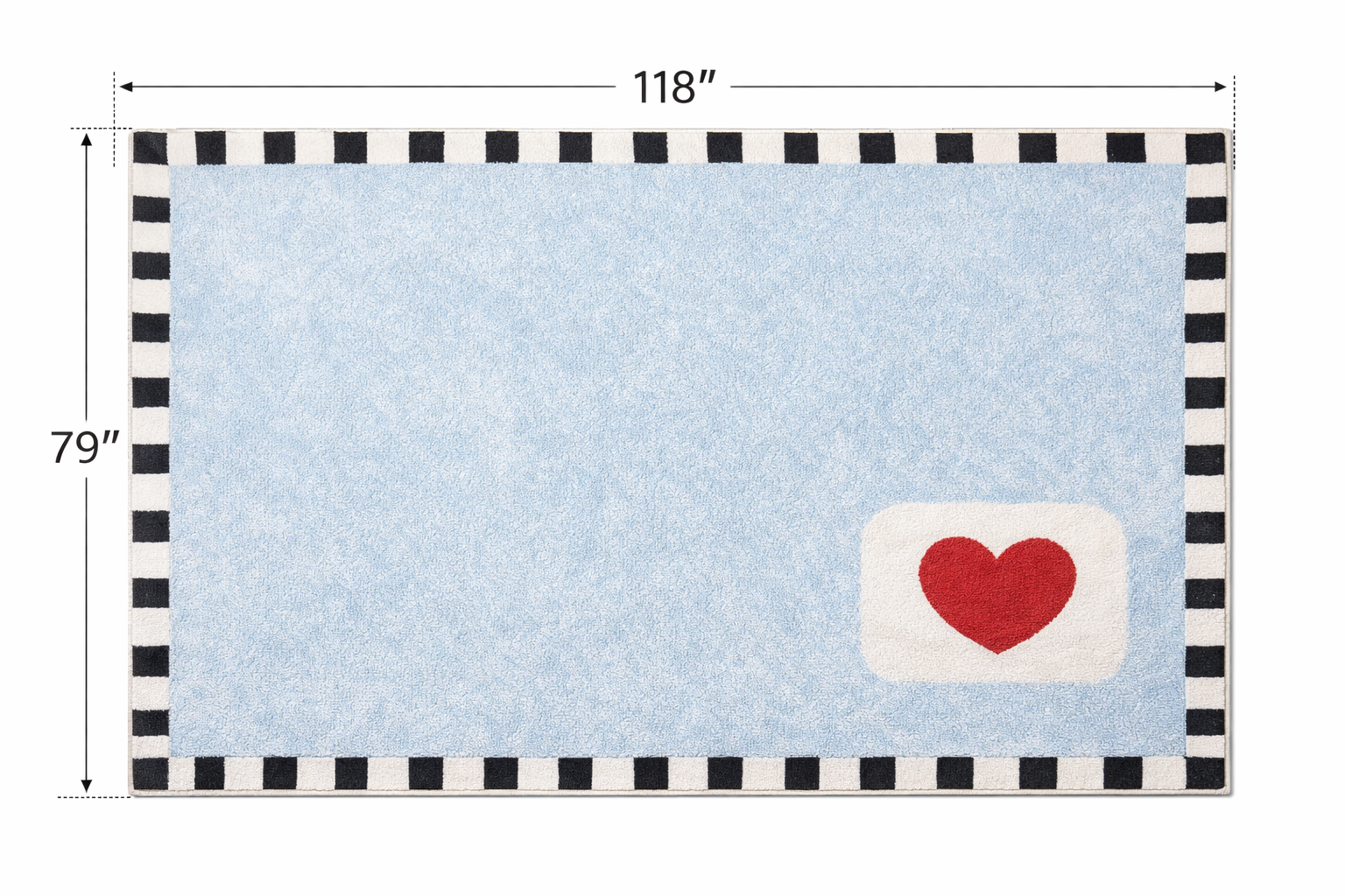 This oversized area rug features a light blue base layered with vivid red heart motifs, bringing a playful yet expressive energy into your space. Framed with a striking black and white border, the design feels balanced—eye-catching without being overwhelming.